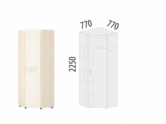 Угловой шкаф для одежды «Тиффани 47.04.1» является частью модульного набора прихожей «Тиффани», который можно использовать в сочетании с другими модулями прихожей и гостиной «Тиффани», а так же как отдельный предмет мебели. В правом отделении установлена штанга для удобного хранения одежды на плечиках. Левое отделение состоит из четырех полок. Модуль является универсальным и может быть собран как с левым, так и с правым открыванием дверки. Петли с доводчиками обеспечивают плавное и бесшумное закрывание дверки. Ножки регулируются по высоте, что позволяет компенсировать возможные неровности пола.